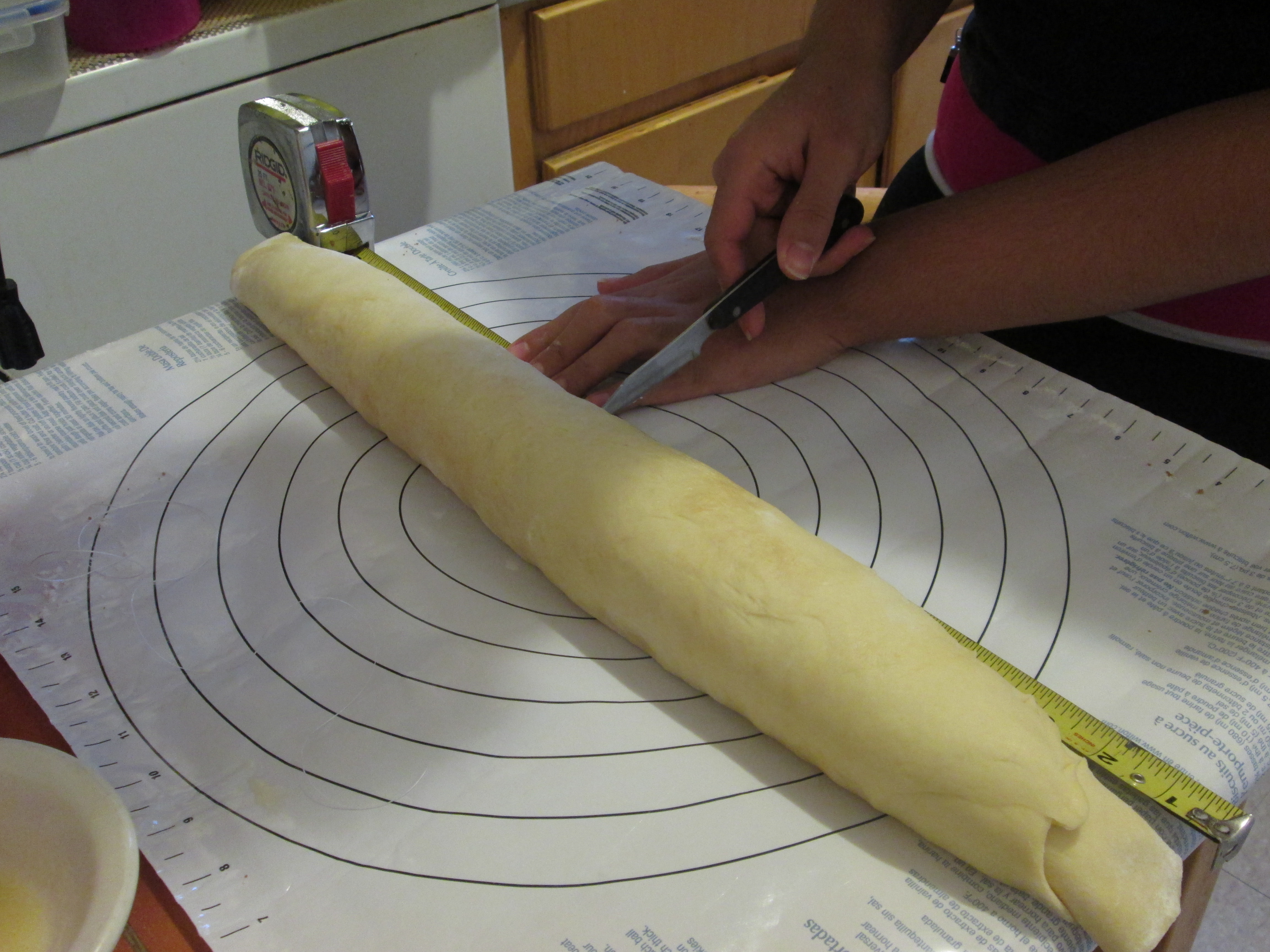 - Line the bottom of a 13x9inch baking pan with parchment paper. Using a unflavored string of floss, cut the rolls into 12 equal pieces. (Slide the floss under the roll and wrap it around the roll to cut/slice.)