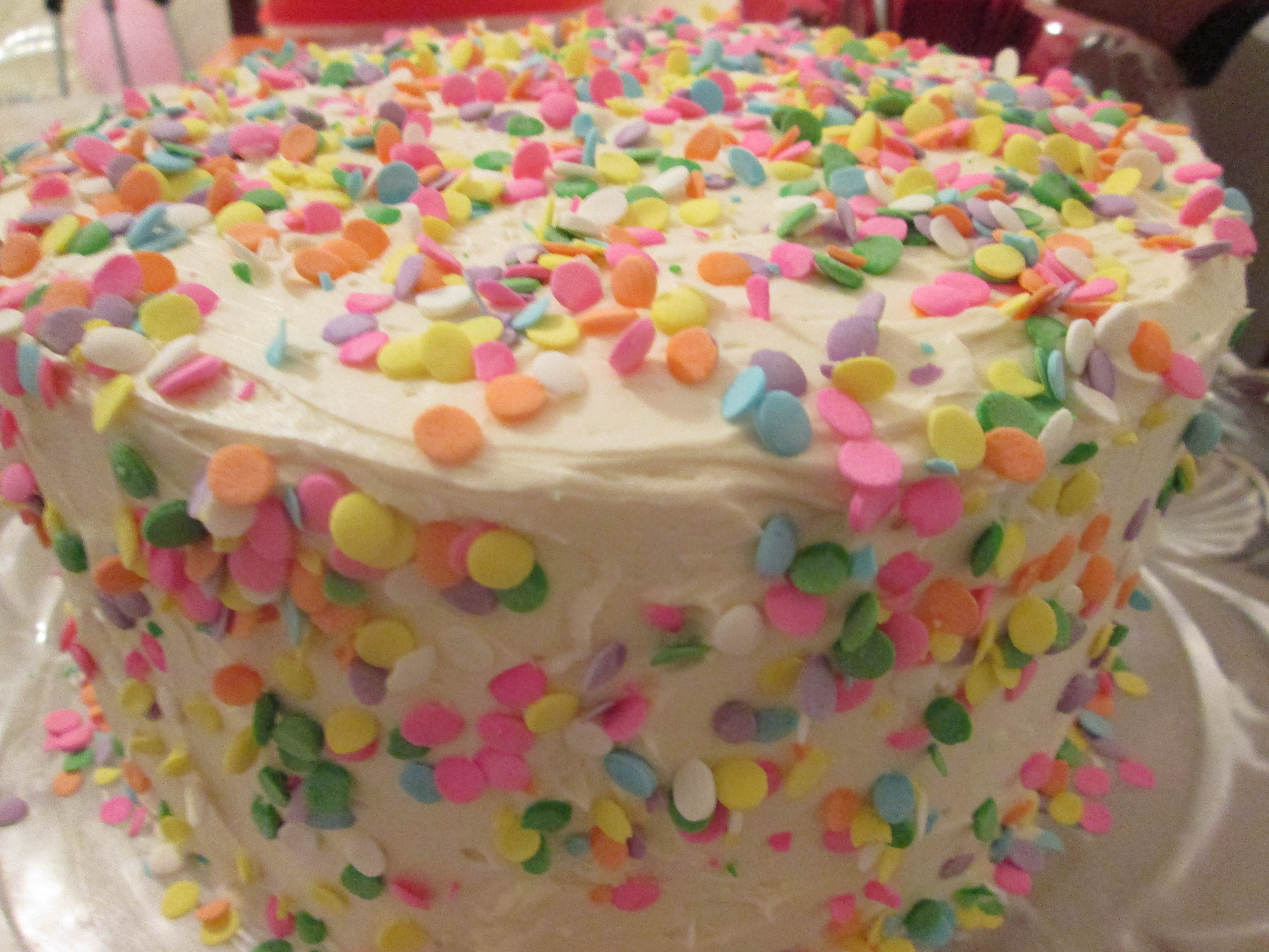 The cake came out amazingly delicious, despite its absence of color inside the cake. The moist and tender cake went very well with the sweet and fluffy frosting, and got a nice crunch from the sprinkles. This delicious cake is just the beginning of all the great things to come. I can already tell this is going to be a sweet year!