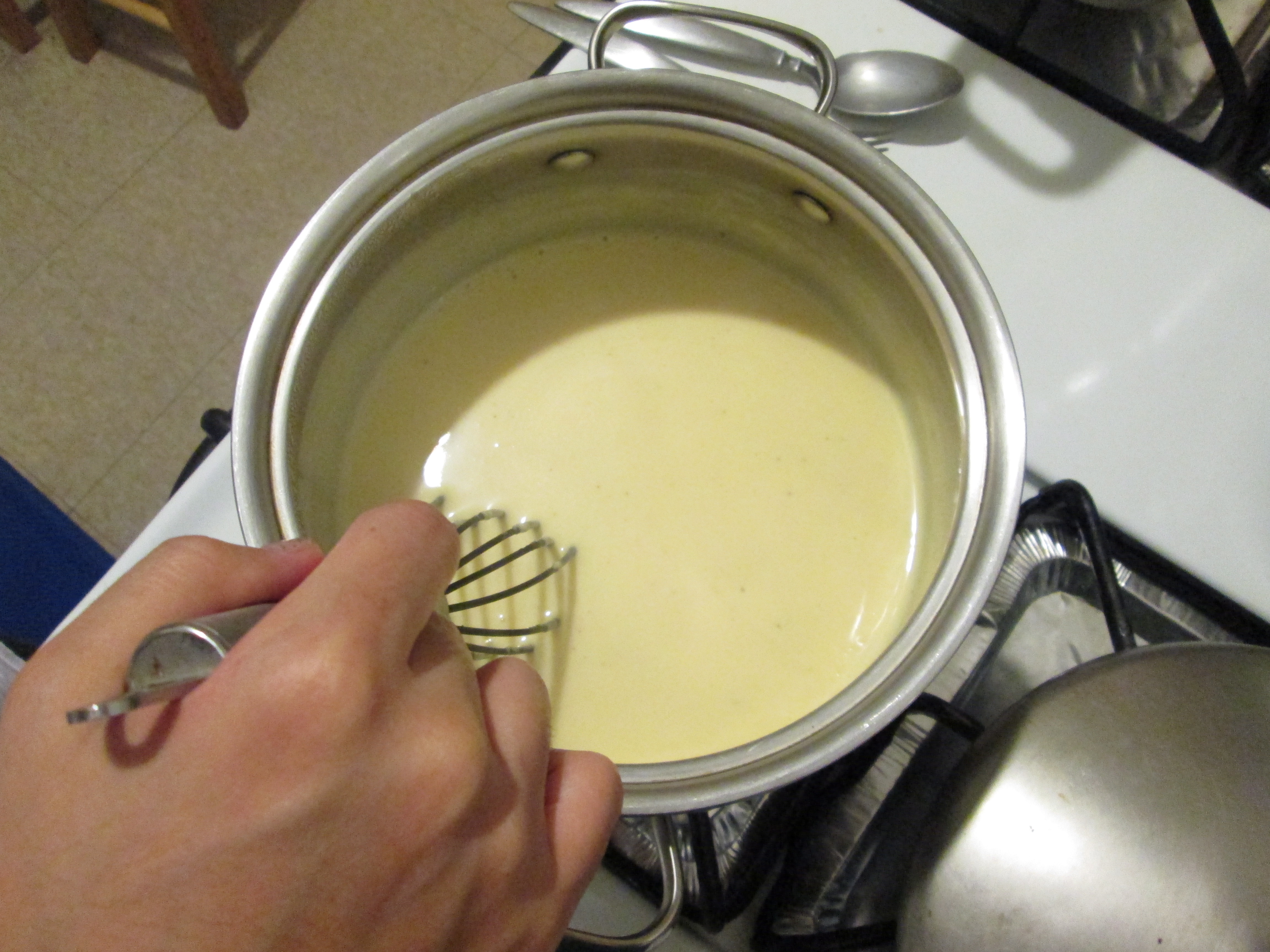 - While whisking, slowly pour the warmed milk, a little at a time. Continue cooking, while whisking, until bubbly and thick (8-12 minutes).
