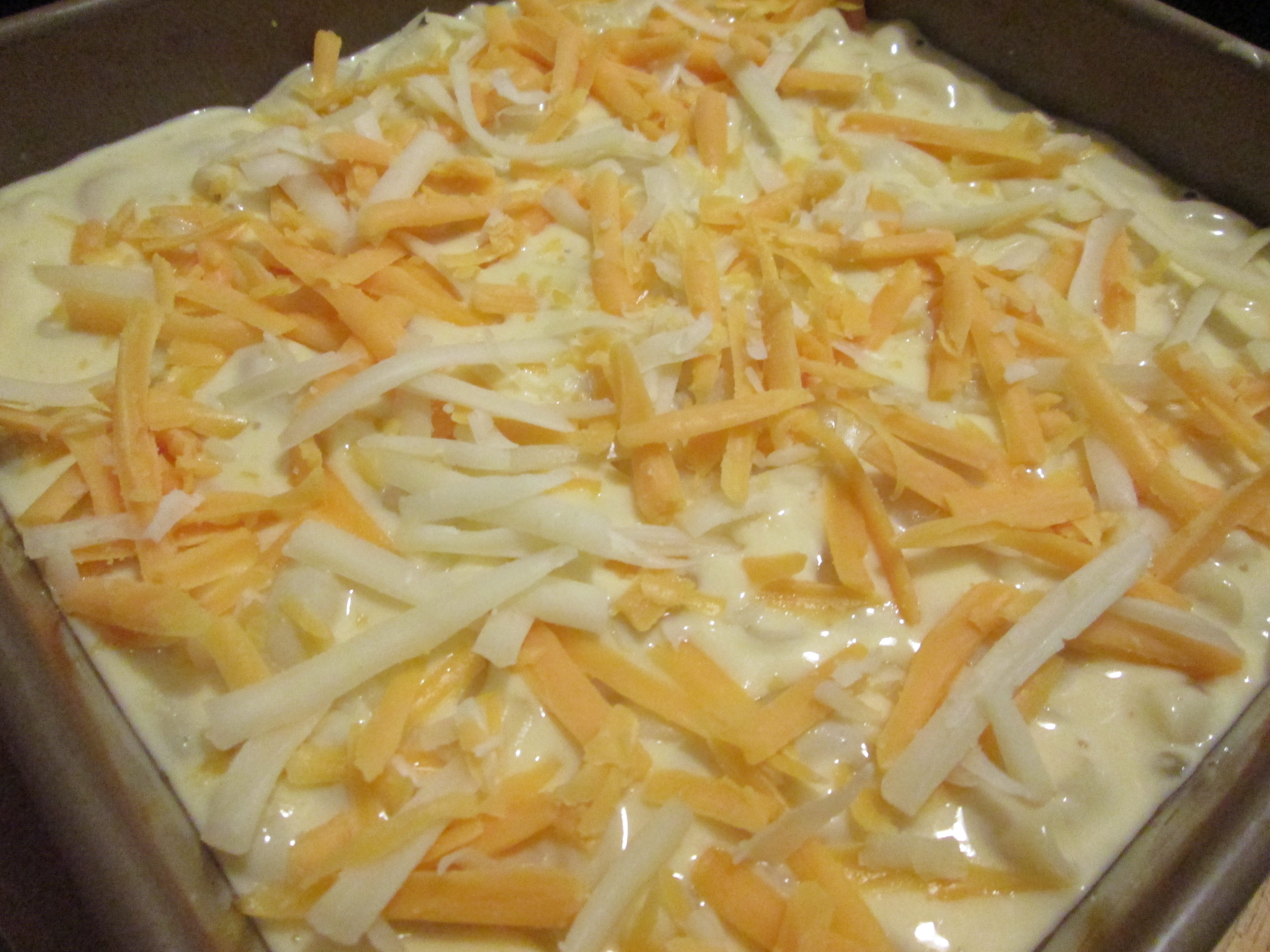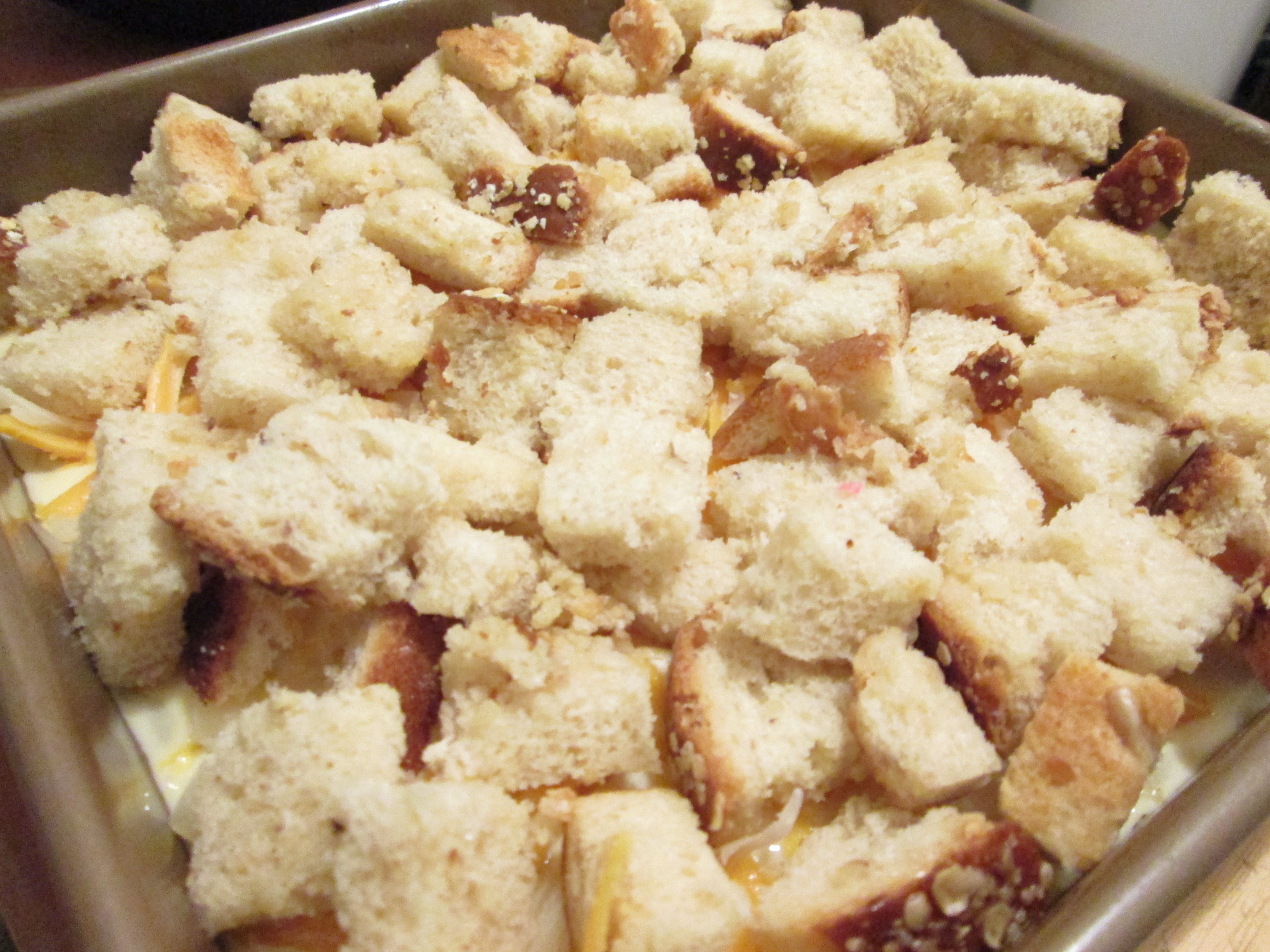- Pour mixture into the prepped dish. Sprinkle the remaining 3/4 cup of Cheddar and 1/4 cup of Gruyére (or 1/8 cup of Pecorino), and then top with the bread cubes. Bake until golden and bubbly, about 30 minutes. Cool for 5 minutes on a wire rack before serving.