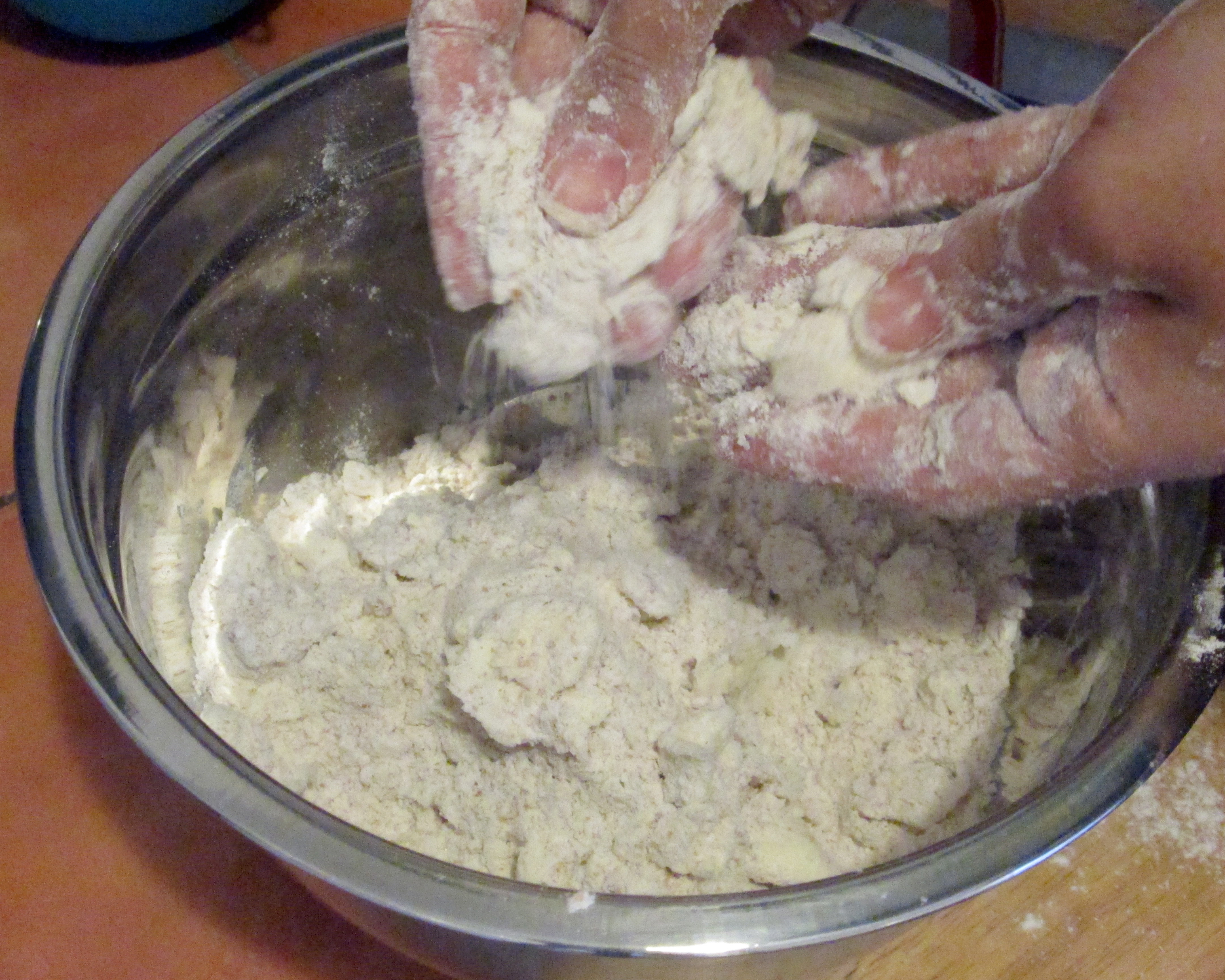 - Whisk flour(s), sugar, baking powder, salt and baking soda in large, wide bowl. Using fingertips, a pastry blender or two forks, work butter into dry ingredients until the mixture resembles a coarse meal. The butter pieces should be about the size of peas; don’t fret if there are bigger pieces.