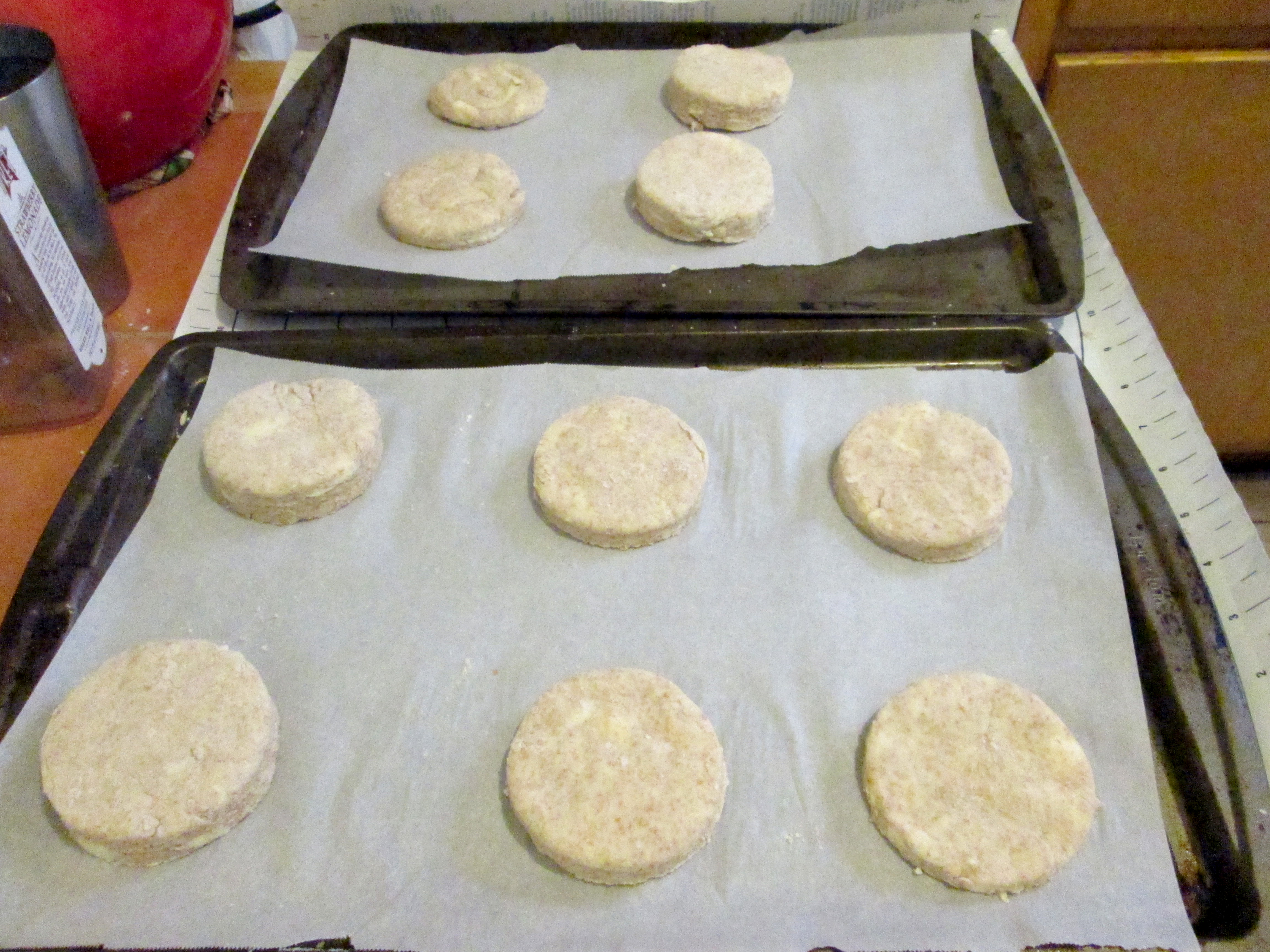 - To form biscuit rounds/cut outs: Transfer dough to floured counter and pat out until about 1/2 to 3/4-inch thick. Using a round cutter (2 inches for regular sized biscuits, 3 inches for the monstrous ones), press straight down — twisting produces less layered sides — and transfer rounds to prepared sheets, spacing two inches apart.