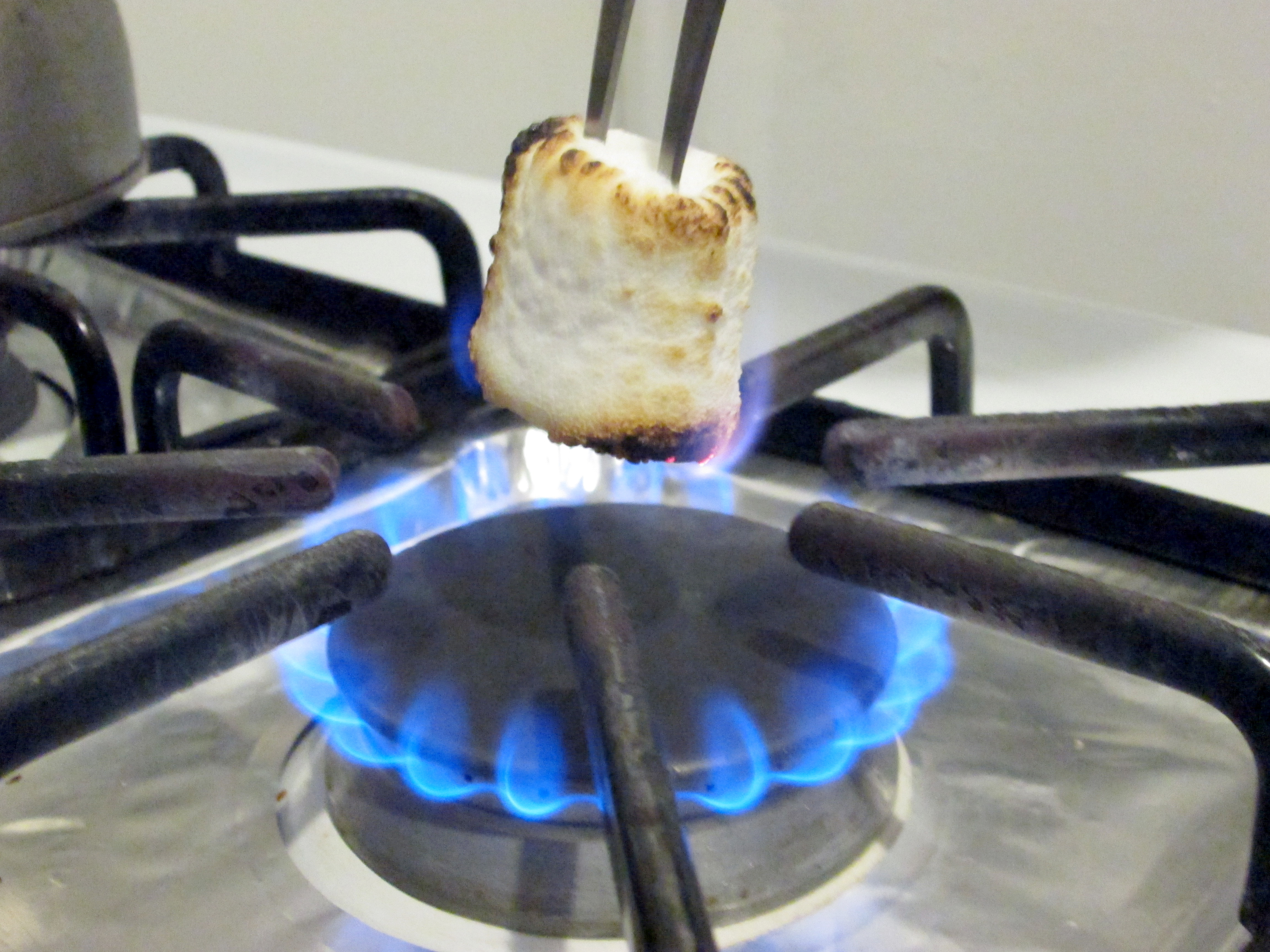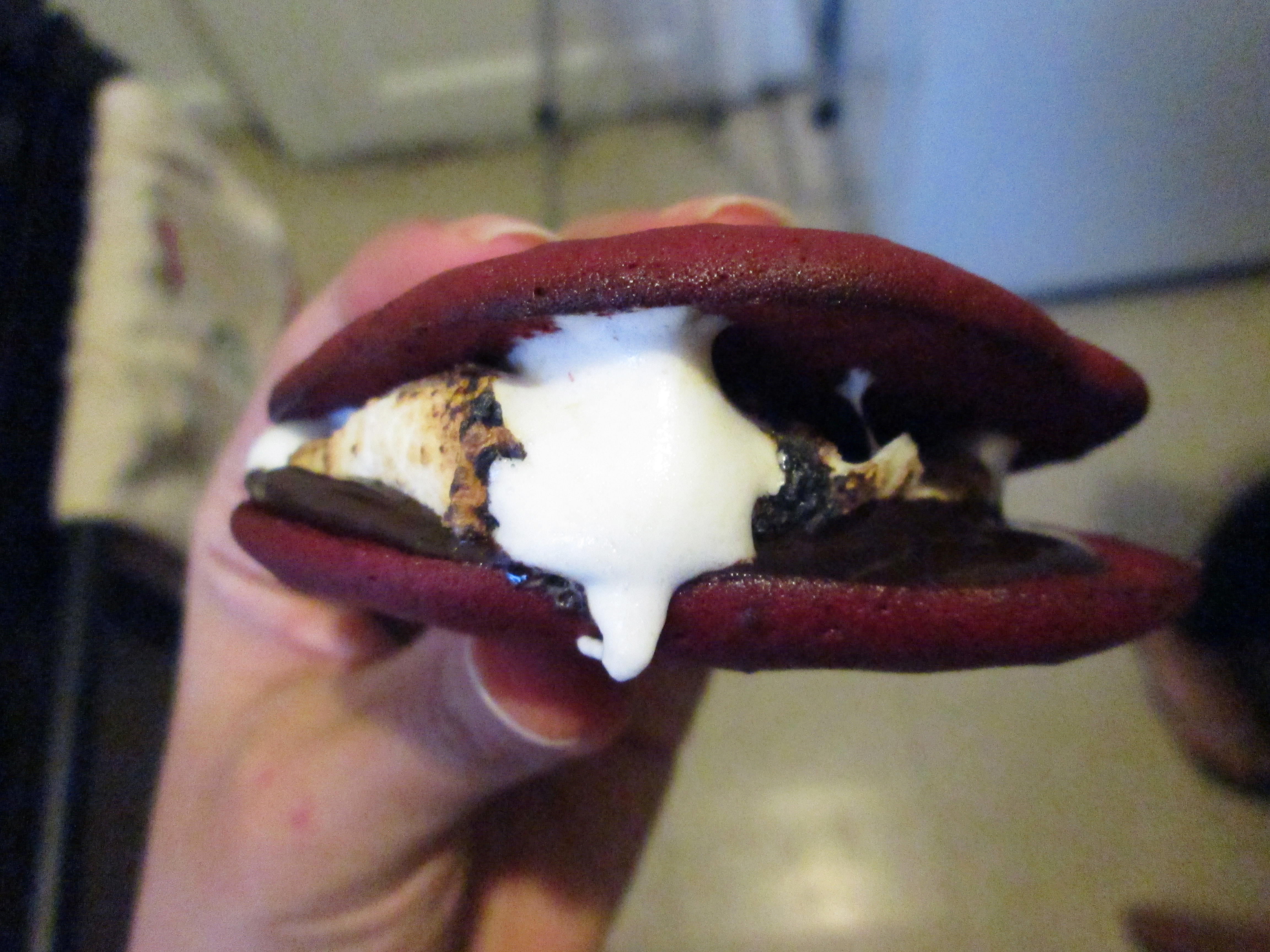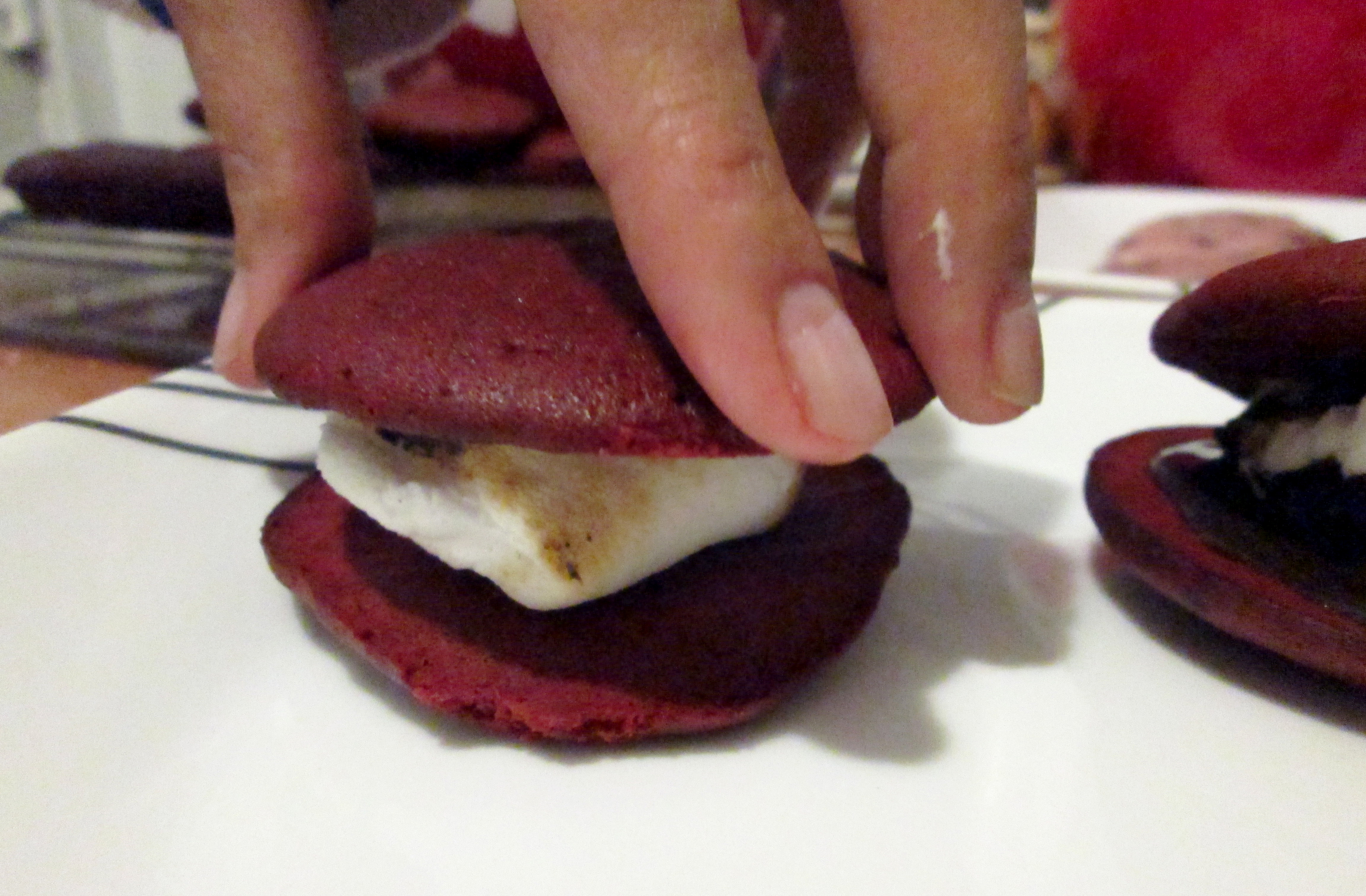 It was a screw up of massive proportions that led me to try and save this dessert. For a few of them, we decided to make some of the tops into s’mores. We roasted marshmallows over the stove, and sandwiched them between two of the tops with a bit of melted semisweet chocolate. Regardless of everything that happened, the whoopie tops themselves were amazing. They were spongey but firm, and had an amazing chocolate taste. Most red velvets skimp on the chocolate but this one is an exception. As a s’more, the melty and gooey marshmallow adds some sweetness to the triple whammy of chocolate.