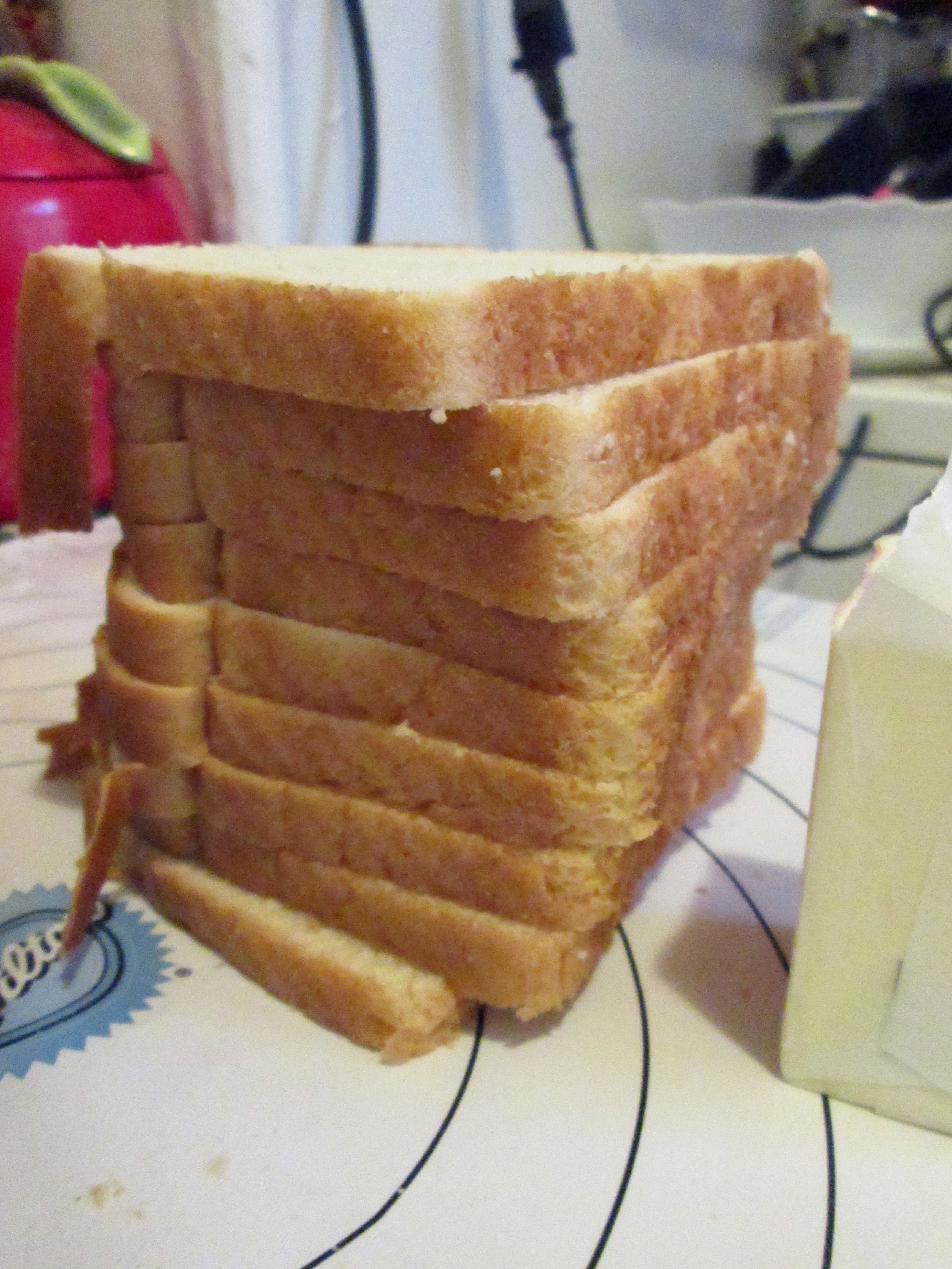 A large bag of sliced white bread recently came into my possession, and I didn’t really know what to do with it. In my house, we eat homemade whole wheat bread (~special snowflake alert~) because it doesn’t make my head hurt, and because it’s easy to make. We stopped buying bread months ago, so eating a slice of processed white bread (or anything highly processed, really) brings an unwanted sugar shock to my body. Since I didn’t want the loaf to go to waste anyway, I decided to make something with it.