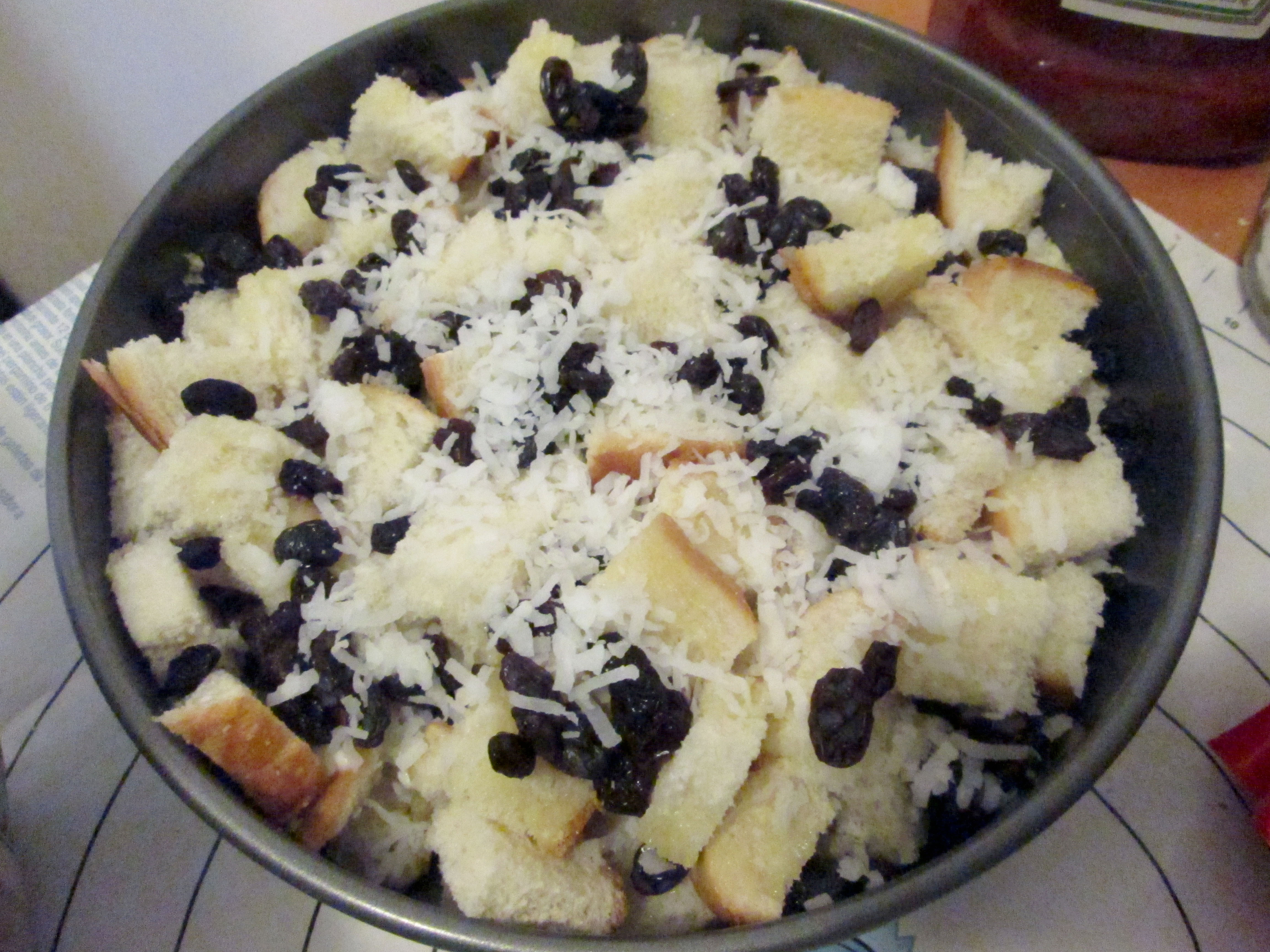 - Preheat oven to 350 degrees F. Cube or break bread into small pieces and place in an 8×8 inch square baking pan (or 9 inch round pan). Drizzle the melted butter over bread, and sprinkle with the raisins and half of the shredded coconut.