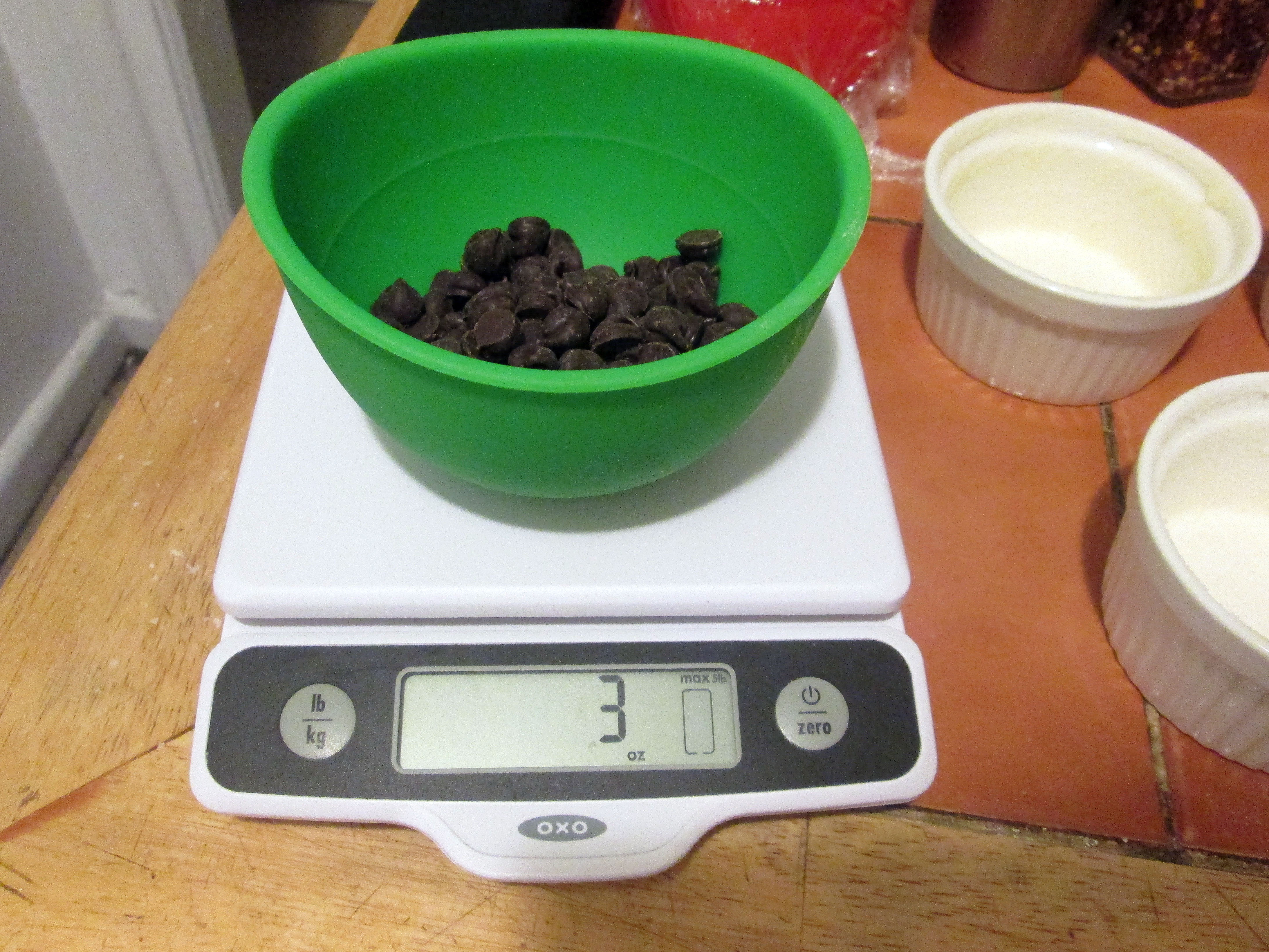 Place the buttered ramekins to the side because it’s chocolate time! Grab three ounces of semi sweet chocolate chips. I used my scale to weigh mine out for accuracy’s sake. I’m not sure how much that is by volume; my guess is almost a cup or so. Throw the chips into a heat proof bowl, along with the room temp butter. Place the bowl over a small pot with simmering water. This setup is called a double boiler. I don’t know why it’s called that, considering that nothing besides the water in the bottom pot could be boiling but okay. This process helps melt the chocolate gently, without burning it. While we’re on the subject of messing chocolate up, take care to not get any water from the double boiler inside of your melting chocolate; it will seize and it just won’t work or be a pretty sight.