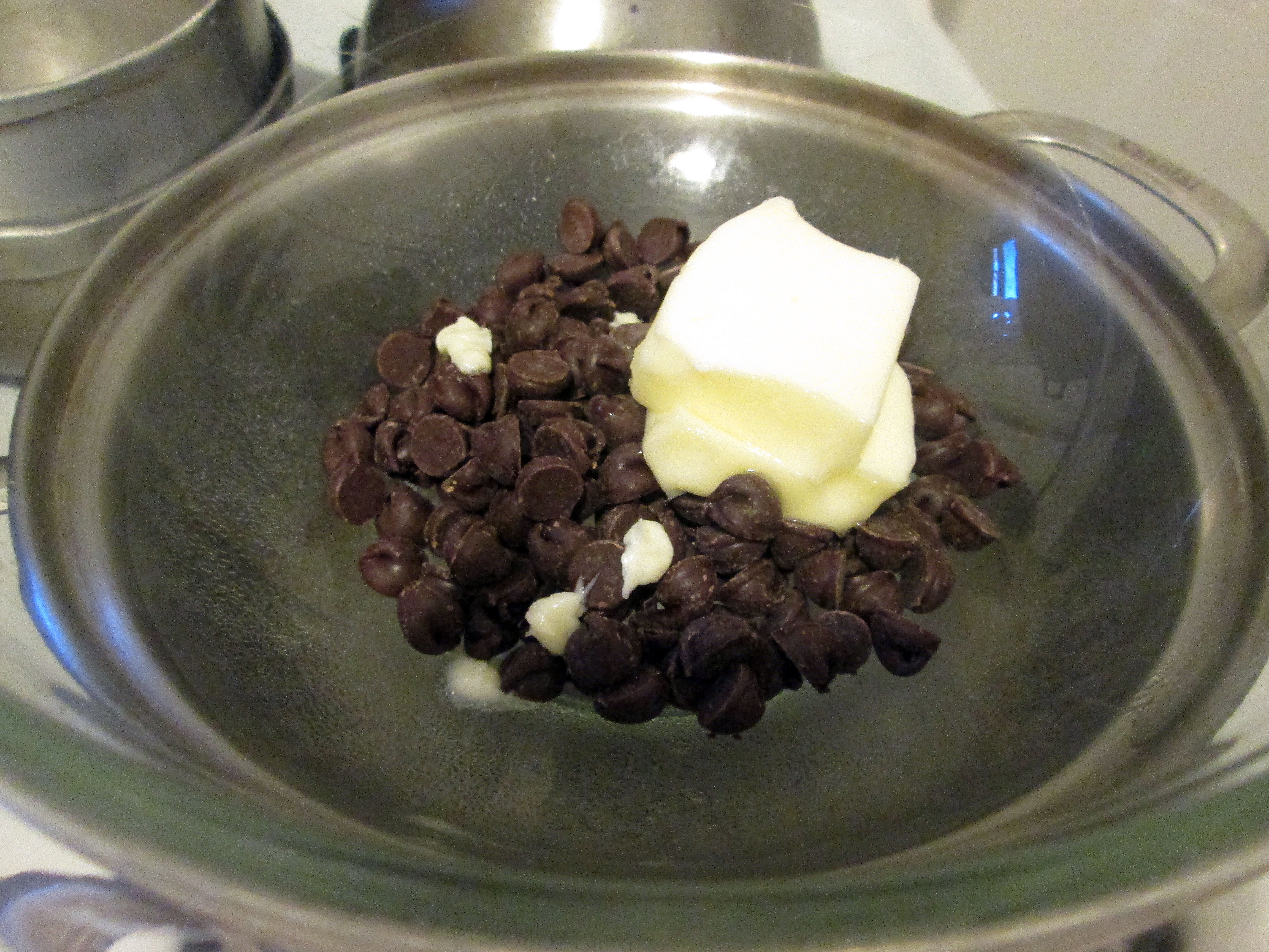 - Over medium-high heat, bring a small pot with a couple inches of water to a simmer. Place a heatproof bowl on the pot, making sure the water is NOT touching the bowl. Add the chocolate chips and butter to the bowl, and stir until completely melted.