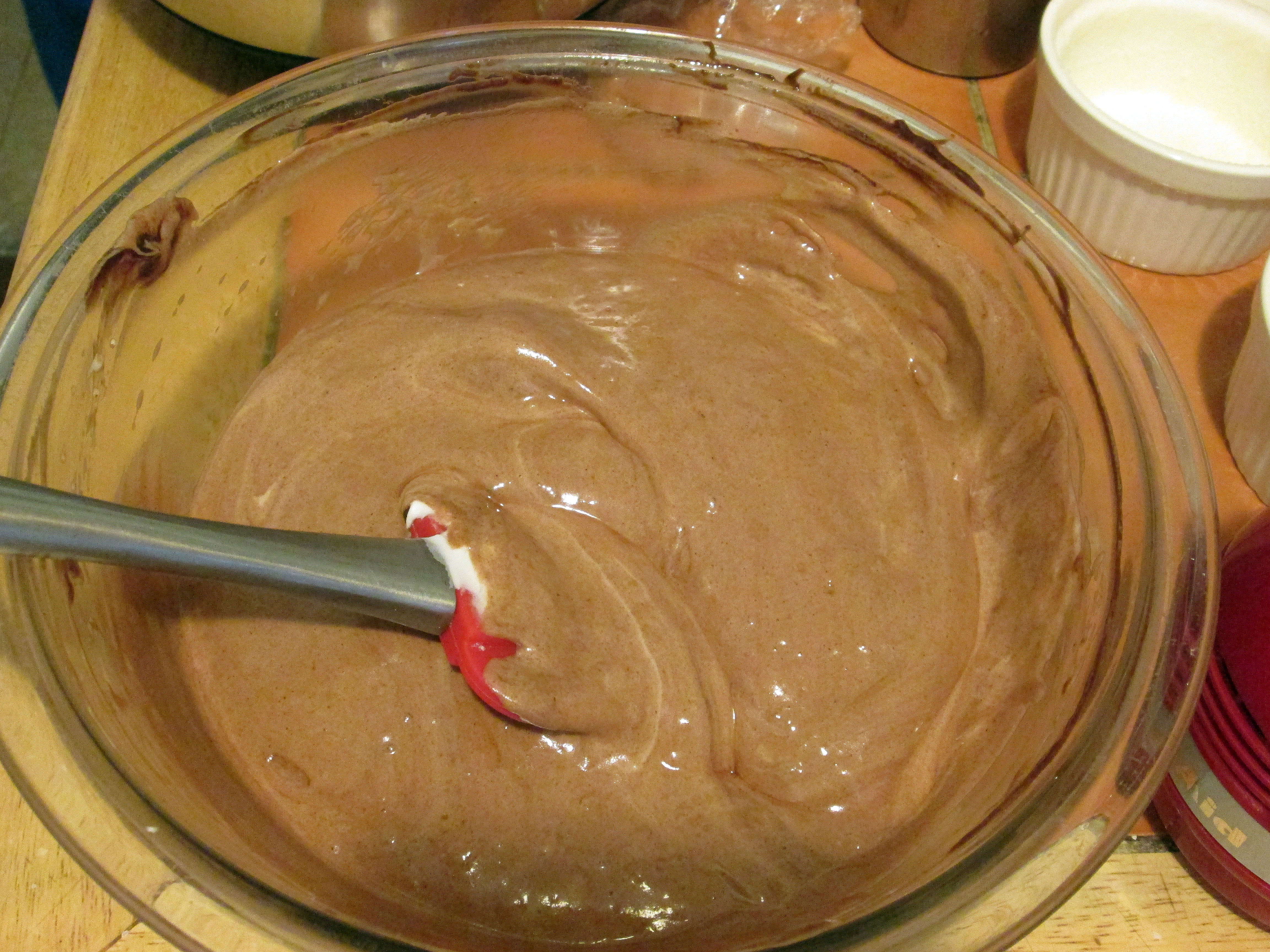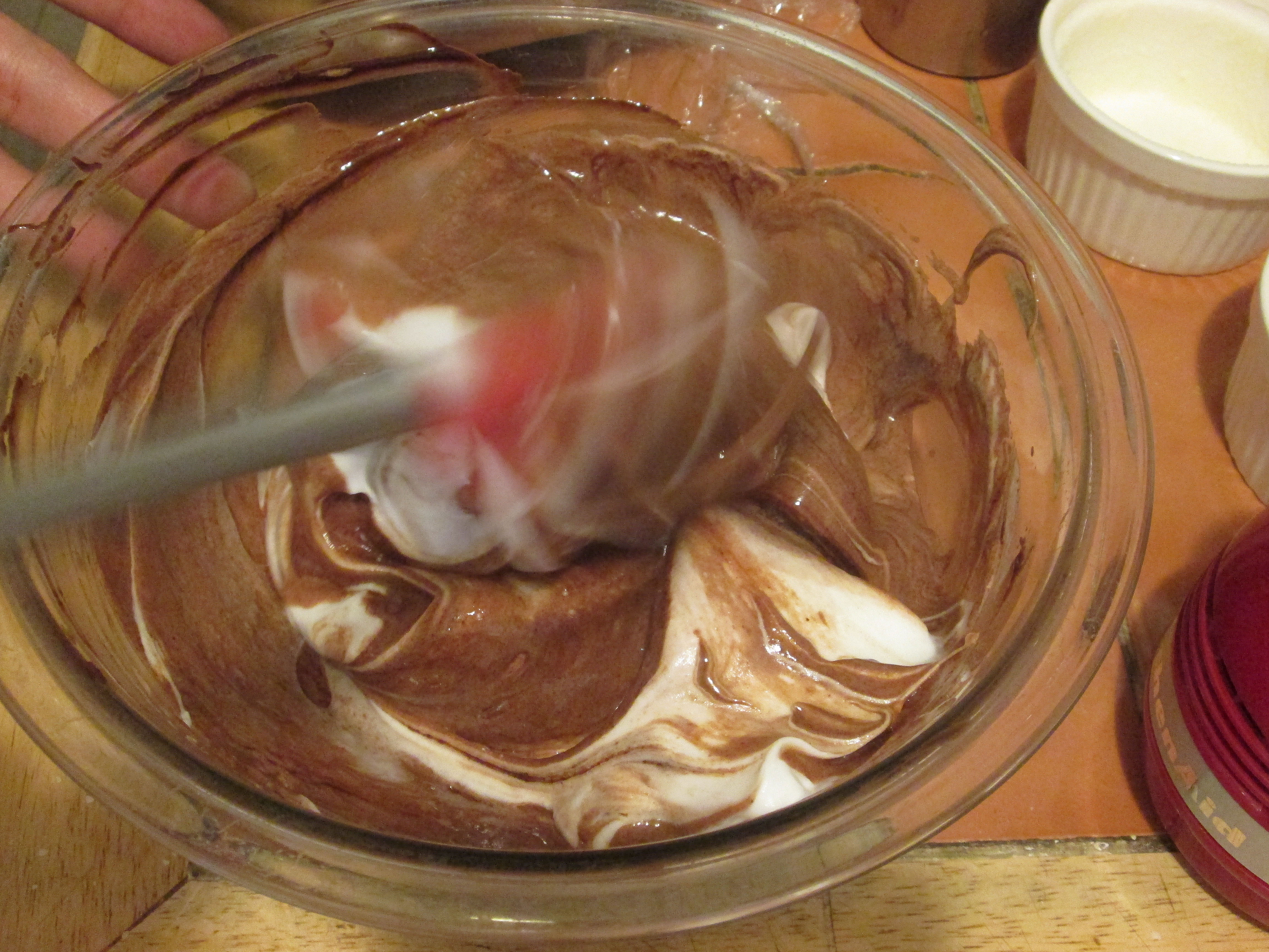 Now that the meringue is done, it’s time to fold it into the chocolate. Do this in two installments with a rubber spatula. Gently fold it it, taking care not to deflate the whites. Rotating the bowl helps for even folding. Don’t fret if you get some streaks, it’s all good!